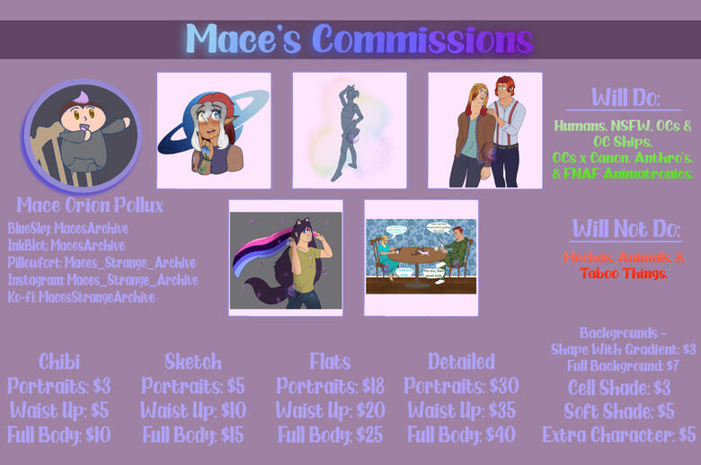 Hello I'm Mace & I've been doing art since I was 10. I'm a self-taught freelance artist who's more on the laid-back side. I like a good horror movie & video games. I'm a part of several fandoms but at the end of the day you’ll have an amazing commission.